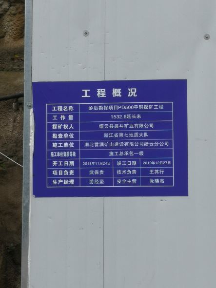 縉云縣鑫斗礦業(yè)有限公司是一家有限責任公司,成立于2007年8月7日,法定代表人:張圣,經(jīng)營范圍:螢石(普通)地下開采;螢石礦勘探;螢石及螢石工藝品加工、銷售。 礦山新建項目名稱為浙江省縉云縣大源鎮(zhèn)嶺后螢石礦,擬建生產(chǎn)規(guī)模15萬噸/年。該礦山項目探礦權于2005年9月首次設立,委托浙江省第七地質(zhì)大隊組織實施。最新核發(fā)的探礦權證有效期限為2020年05月26日至2022年05月26日,勘查范圍由22個拐點組成。